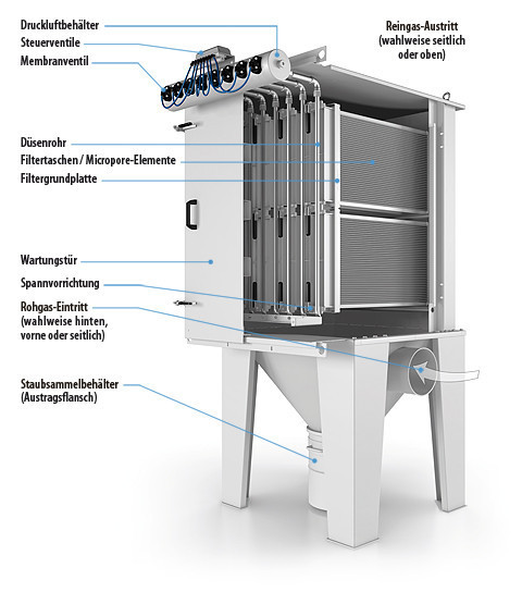 Die Masseträgheitskräfte werfen den auf der Außenfläche der Filtertasche haftenden Staub ab. Gleichzeitig transportiert die eingeblasene Luft große Mengen des im feinen Nadelfilz sitzenden Staubes nach außen. Dieser Prozess wiederholt sich in präzise einstellbaren Intervallen von Filtertasche zu Filtertasche.